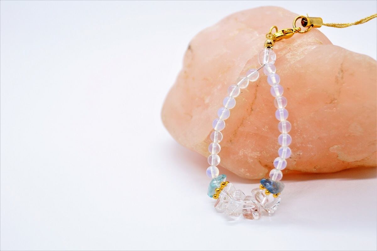 【ムーンストーン】…古代インドでは月が宿る「聖なる石」として崇拝されてきた石。月は潮の満ち引きに関連することから女性性を象徴し、また平和や予知の石とも言われています。ヨーロッパでは古くから暗い夜道を照らすとされ、旅のお守りとしても使われてきました。
