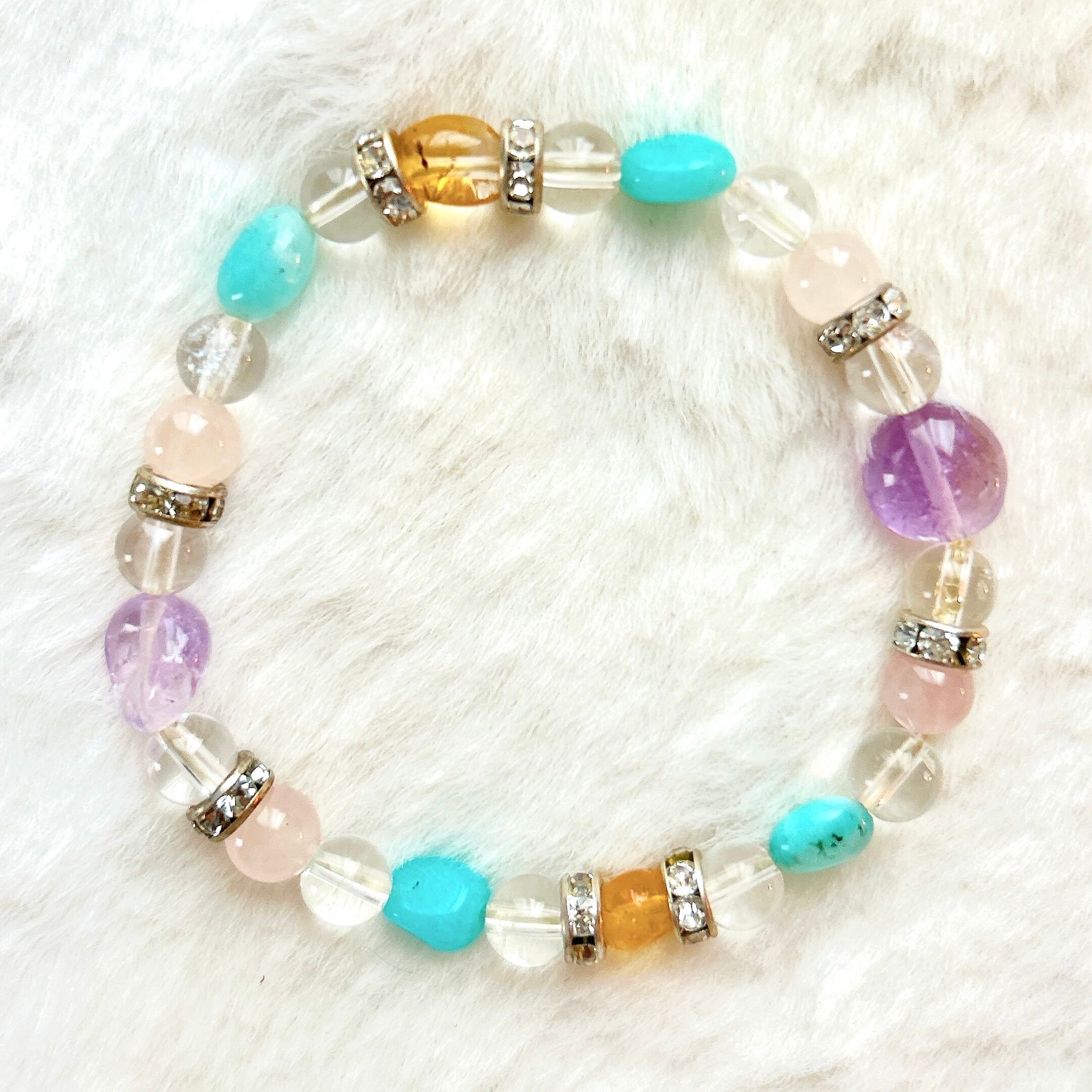 シトリンの明るい黄色、アマゾナイトの深い青緑、ローズクォーツの優しいピンク、アメジストの神秘的な紫、そして水晶の透明感が溶け込んだブレスレット